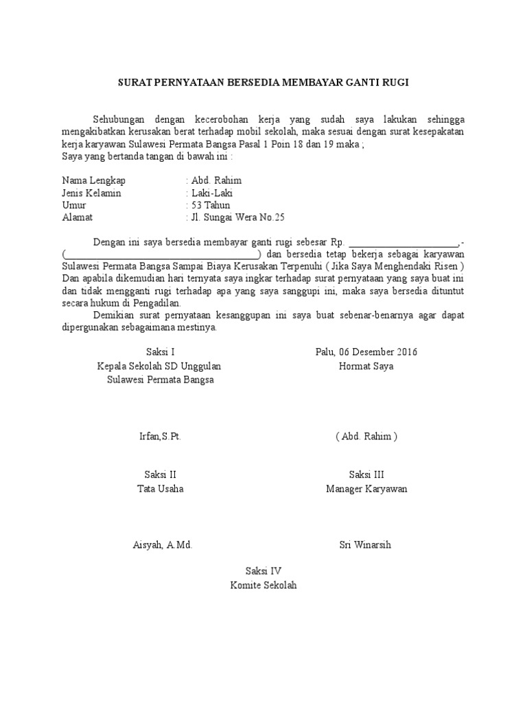 Surat Pernyataan Bersedia Membayar Ganti Rugi Pdf